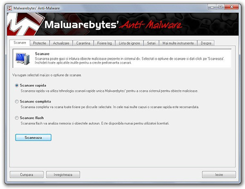 Virusii nu sunt singurii care pot pune in pericol integritatea sistemului de operare Windows, si din acest motiv este bine sa utilizam solutii Anti-Malware pentru a detecta si indeparta din sistem rogue, spyware, adware si troieni. Una dintre cele mai bune astfel solutii de securitate esteMalwarebytes, o aplicatie gratuita (dispune si de versiune shareware) cu un nivel superior de detectie a acestui tip de amenintari decat o buna parte a alternativelor comerciale.